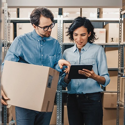 Logistiikka mies ja nainen varastossa läppärin kanssa