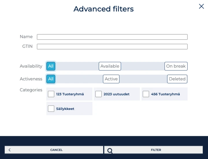 Advanced filters allow you to select the product displayed in the based on availability, activeness or user-created categories.