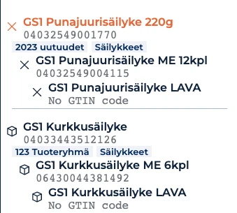 Editing of product information is started from the Master data icon in the main menu. The side panel lists all the products stored in GS1 Golli. This list shows all the products saved in GS1 Golli based the GTIN codes. Products can be searched for example based on the product name by using the Free filter field.