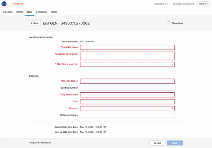 With this instruction, you can create a party or location identifier GLN identifier in the GS1 Rekisteri.