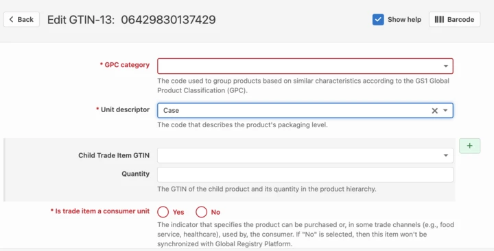 When you create a GTIN-13-coded case or pallet in GS1 Rekisteri, enter Case or Pallet as the hierarchy level in edit mode. You get new fields to fill in, where you can enter the GTIN of the included product and the quantity, i.e. how much of it there is in the unit on the upper level.