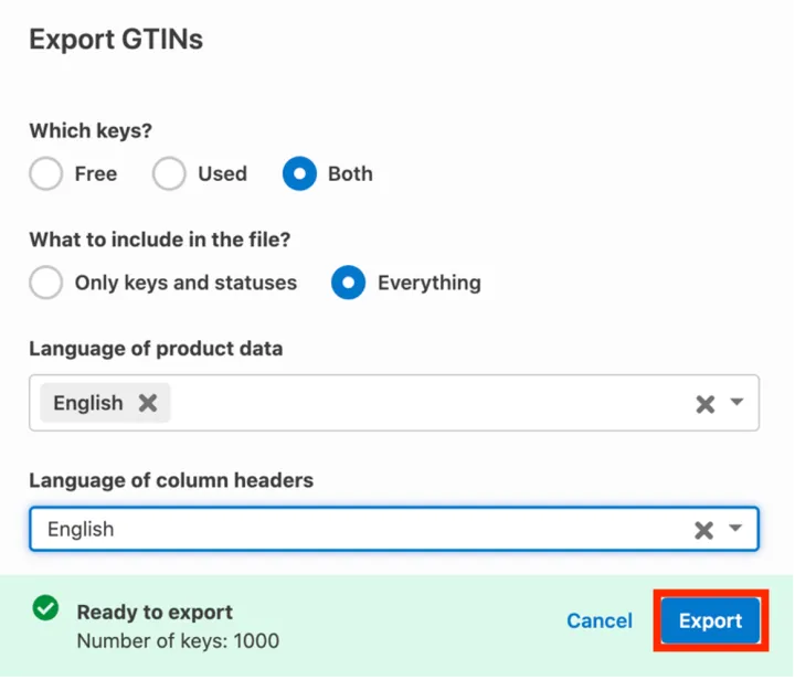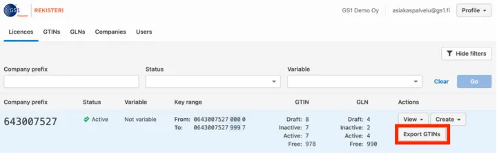 On the Licences tab, on the right side of the row of each GS1 Company Prefix, you'll find the Actions column. Click Export GTINs to get started.