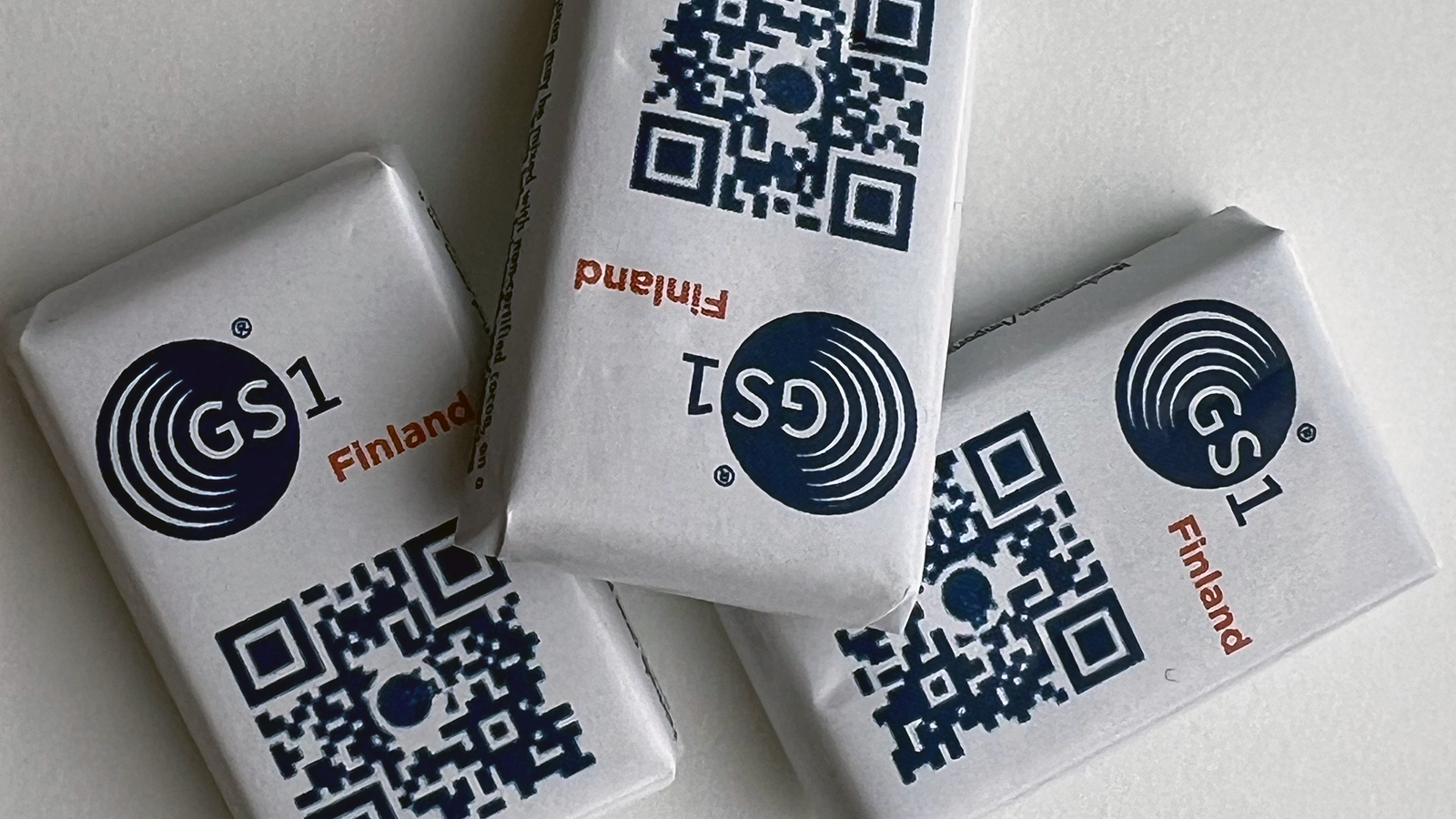Osoittaaksemme, miten 2D-viivakoodi käytännössä toimii, olemme tehneet kuvitteellisen GS1 Suklaan. Se on pienikokoinen tuote, jossa on painettuna vain välttämättömät lainsäädännön velvoittamat tiedot. Tuotteeseen painetun 2D-viivakoodin avulla voit kuluttajan silmin testata siirtymistä verkkoon tarkastelemaan tuotteesta annettuja lisätietoja.