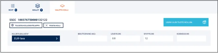 Siirrytään käsittelemään uutta kollia klikkaamalla kollin SSCC-koodia.