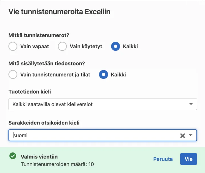 - Valitse Exceliin tulevat tiedot mahdollisimman kattavasti (katso kuva alla) ja paina Vie.