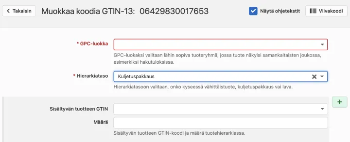 Kun luot GS1 Rekisterissä GTIN-13-kooditetun kuljetuspakkauksen tai lavan, syötä muokkaustilassa hierakiatasoksi Kuljetuspakkaus tai Lava. Saat täytettäviksi uudet kentät, joihin voit syöttää sisältyvän tuotteen GTIN-koodin ja määrän, eli minkä verran sitä on ylemmällä hierakistasolla olevassa yksikössä.