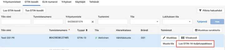 GS1 Rekisteri – GTIN-koodin luominen kuljetuspakkaukselle tai lavalle