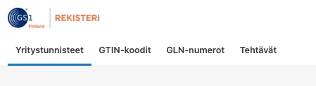 GS1 Rekisterin käyttöliittymässä on neljä osiota: Yritystunnisteet, GTIN-koodit, GLN-numerot sekä Tehtävät.