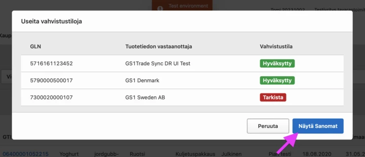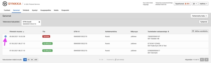 Sanomat-osiossa voit tarkastella vahvistustilakuittauksen yhteydessä lähetettyä tuotetietojen korjauspyyntöä. Pääset Sanomat-osioon klikkaamalla “Näytä Sanomat”-nappia vahvistuskuittaus ikkunassa.