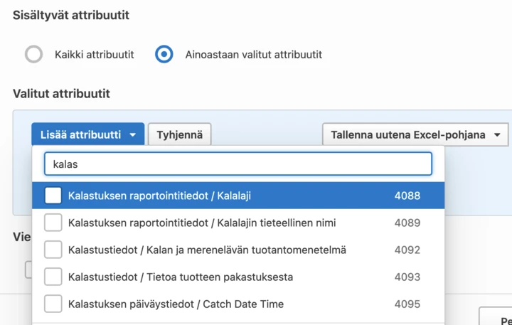 Valitse seuraavaksi, mitkä tuotetiedot haluat viedä Excel-pohjalle. Valitse Ainoastaan valitut attribuutit ja hae haluamasi tuotetiedot klikkaamalla Lisää attribuutti -painiketta.