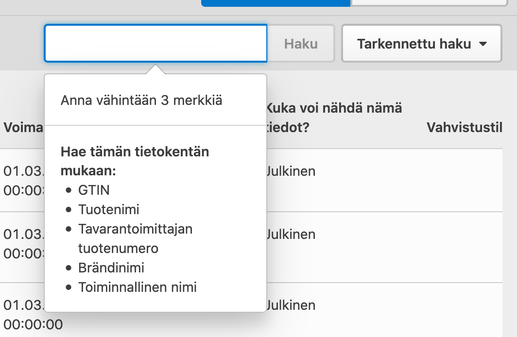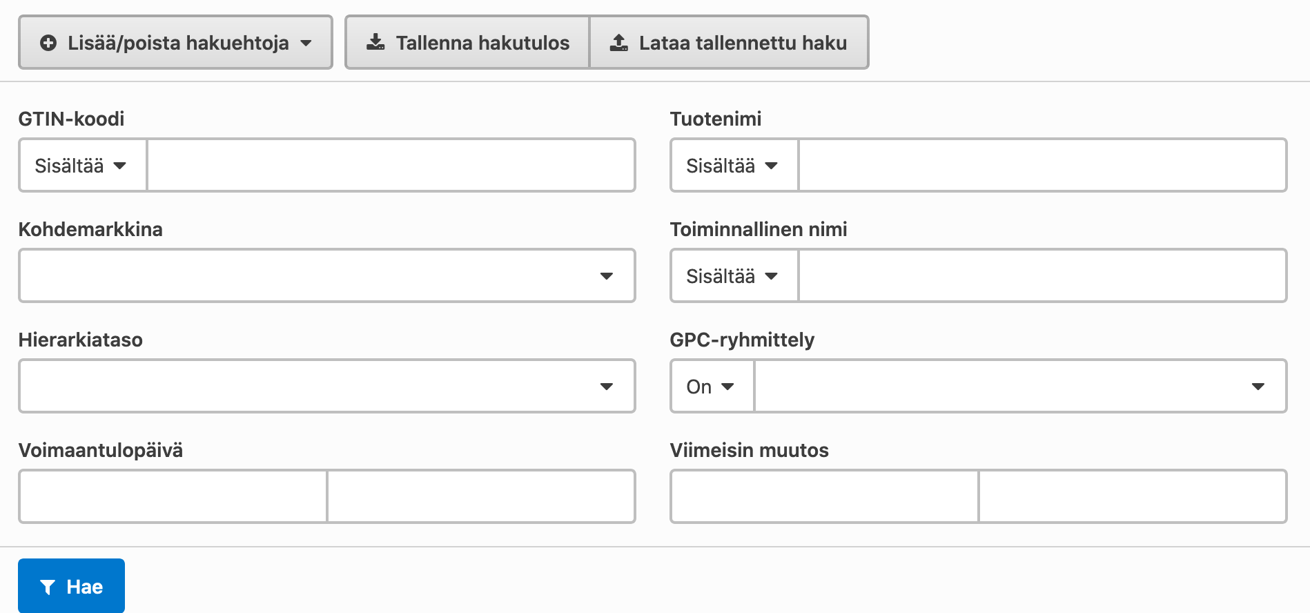 Haku-kentän avulla voit hakea tuotteita viidellä eri hakuehdolla: GTIN, Lyhyt tuotenimi, Lisätunnisteen tyyppi: Tavarantoimittajan tuotenumero, Brändinimi ja Toiminnallinen nimi. Kirjoita hakuehto ja klikkaa Hae-painiketta.
