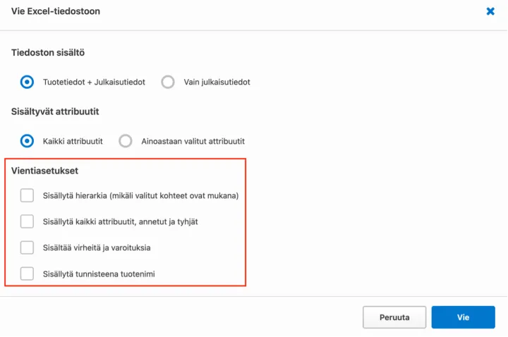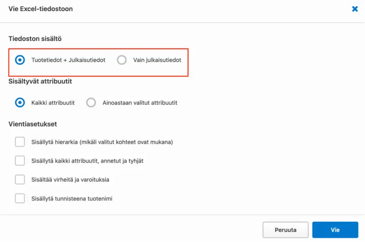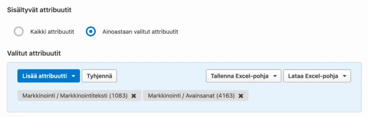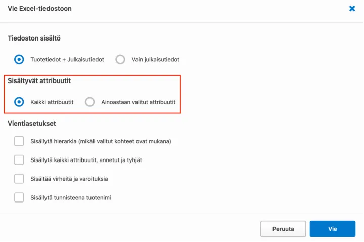 • Sisällytä kaikki attribuutit, annetut ja tyhjät: Tämä valinta vie Exceliin myös ne attribuutit, joille ei ole ylläpidetty tietoa. Esim. jos tuotteella ei ole Markkinointitekstiä, siirtyy Exceliin tyhjä sarake johon tieto voidaan lisätä.