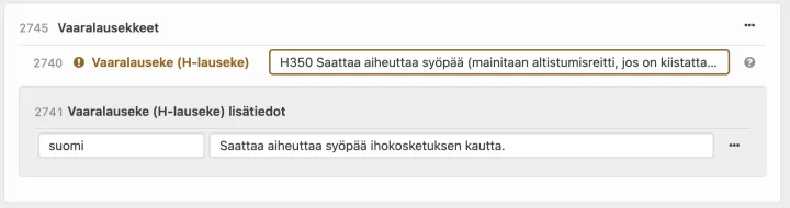 • Vaaralauseke (H-lauseke) lisätiedot (id 2741)