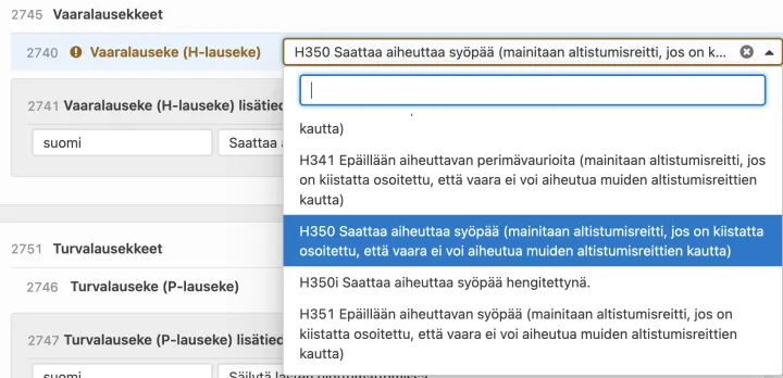 GS1 Synkassa Vaaralauseke (H-lauseke) (id 2740) ja Turvalauseke (P-lauseke) (id 2746) valitaan koodilistalta.