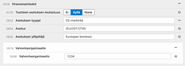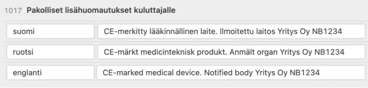 Kirjoita kenttään ”CE-merkitty lääkinnällinen laite” sekä ilmoitettu laitos ja sen numero. Suosituksena on ilmoittaa tiedot suomeksi, ruotsiksi ja englanniksi.