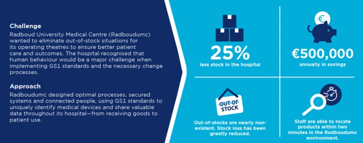 Hollannissa Radboud University Medical Center (Radboudumc) on saavuttanut merkittäviä tuloksia käyttämällä GS1-standardeja osana varastonhallintaansa. GS1-standardeihin pohjautuvat parannetut prosessit ovat pienentäneet varastotasoja 25 prosenttia ja 25 prosenttia vähemmän vanhentuneista tuotteista aiheutunutta hävikkiä. Tarvittavat välineet eivät käytännössä koskaan ole loppu varastosta, silloin kun niitä tarvitaan. Lisäksi potilasturvallisuus on parantunut merkittävästi.
