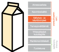• Tuotteen säilyttämiseen liittyvät ohjeet, esimerkiksi "säilytettävä lasten ulottumattomissa" tai elintarvikkeella  elintarviketietoasetuksen (2 jakso, 25 artikla) mukaiset elintarvikkeiden säilytysolosuhteet.