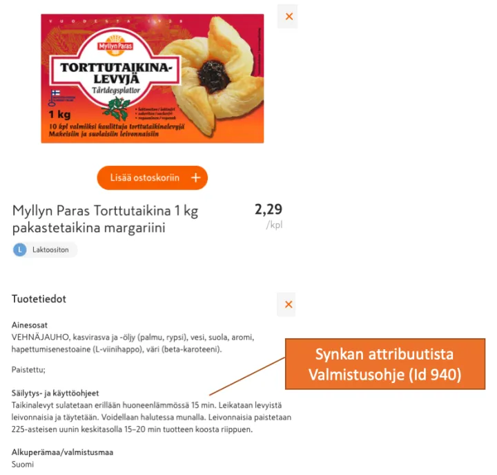 Verkkokaupoissa ohjeiden otsikkotekstit voivat olla Synkasta poikkeavat. Ensimmäisessä esimerkissä K-Ruoka verkkokaupassa on näkyvillä Synkkaan annettu Valmistusohje (Id 940).